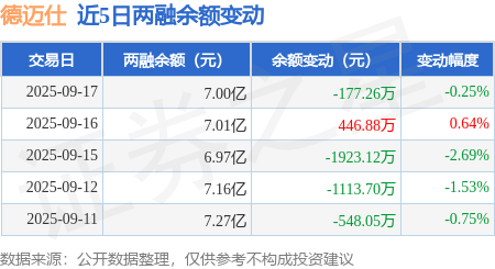 德迈仕:9月17日融资买入3600.58万元,融资融券余额7亿元