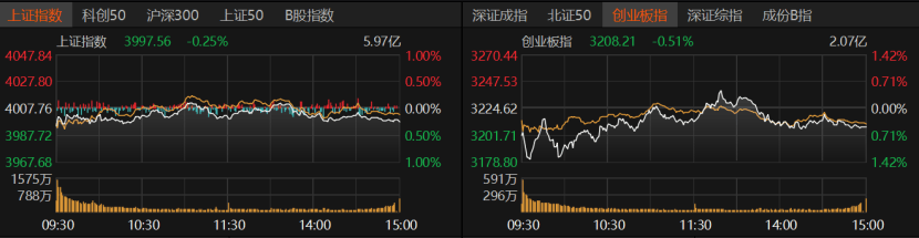 今日,沪指收跌0.25%报3997.56点;创业板指收跌0.51%,科创50跌逾1%,深证成指、沪深300、上证50微跌。交易量小幅回落,今日成交额2.02万亿元,较昨日2.08万亿元微跌。杠杆资金的热度不减反增,沪深京两融余额达2.5万亿元。