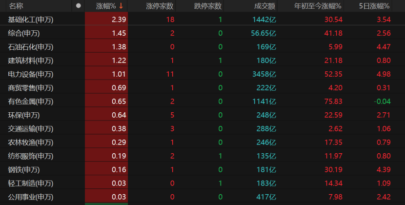 基础化工、综合、石油石化、建筑材料、电力设备等板块领涨,计算机、电子、家用电器、汽车等板块跌幅超过1%。