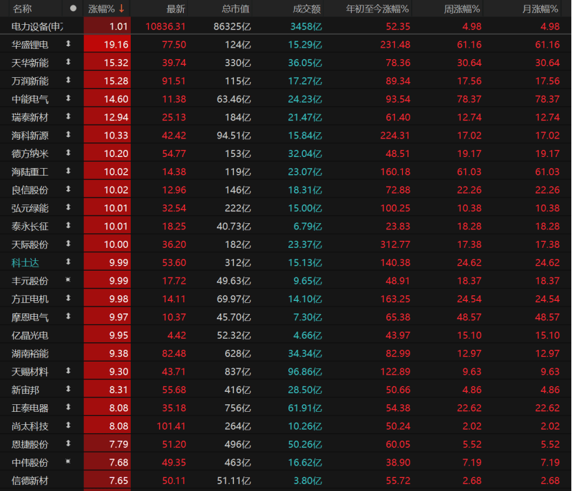 电力设备板块表现不错,华盛锂电、天华新能、万润新能、中能电气、瑞泰新材、海科新源涨幅超过10%,海陆重工、良信股份、弘元绿能、泰永长征、天际股份、科士达、丰元股份、方正电机、摩恩电气、亿晶光电等个股涨停。