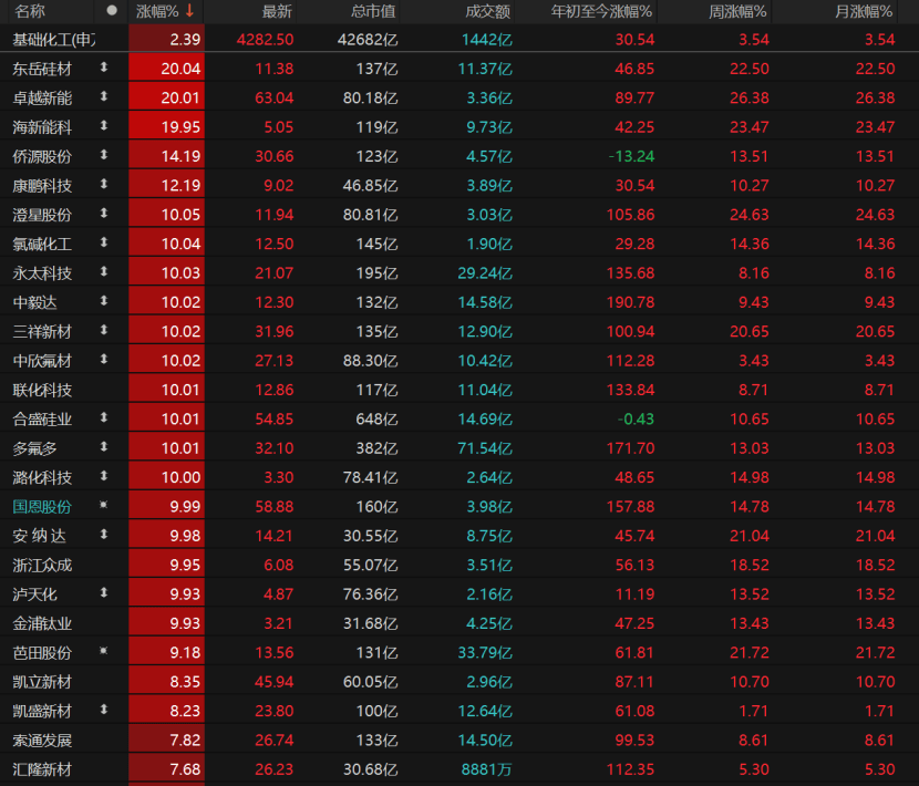 基础化工板块涨逾2%,18只个股涨停。东岳硅材、卓越新能、海新能科“20cm”涨停,侨源股份、康鹏科技大涨,澄星股份、氯碱化工、永太科技、中毅达、三祥新材、中欣氟材、联化科技、合盛硅业等个股涨停。
