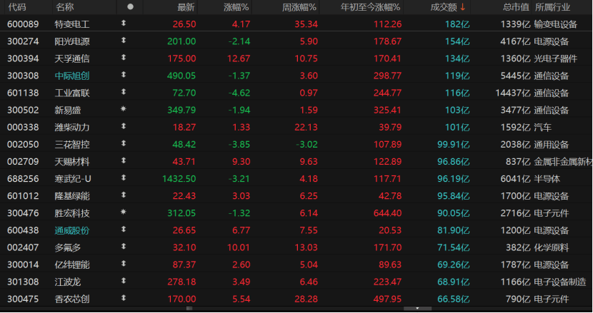 今日共计2101只个股收涨,涨停股63只;3162只个股收跌,跌停股8只。7只个股日成交额超过100亿元,特变电工涨逾4%收报26.5元/股,天孚通信涨近13%,天赐材料涨逾9%;阳光电源跌逾2%,中际旭创收跌1.37%,新易盛跌近2%,工业富联跌近5%,三花智控跌约4%。