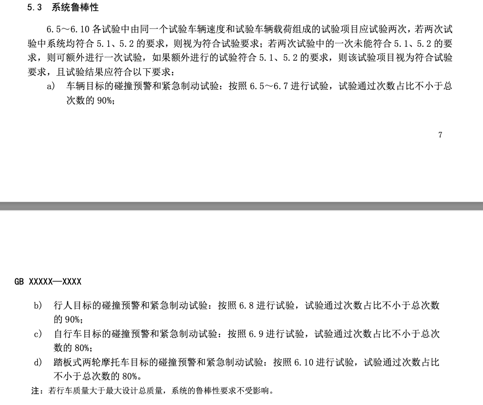 文件同样指出了AEB系统容错标准。AEB强制国标(报批稿)显示,针对车辆、行人目标,试验的容错率为10%;针对自行车、踏板两轮摩托车目标,试验的容错率在20%。