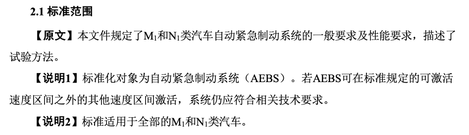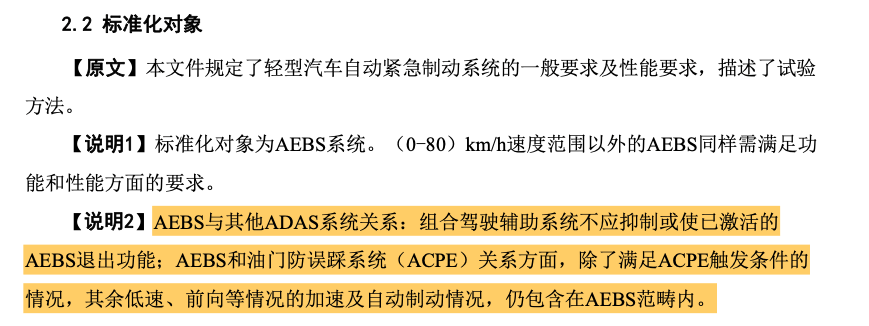 比较有意思的一处改动,是编制说明中对“标准化对象”的说明。此前,征求意见稿的编制说明在“标准化对象”的说明中,阐释了AEBS与其他ADAS系统的关系,比如组合驾驶辅助系统不应抑制或使已激活的AEBS退出功能。这也意味着,AEBS功能的优先级高于组合驾驶辅助系统。