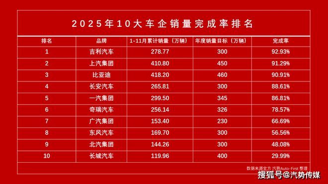 据汽势Auto-First统计,吉利、上汽、比亚迪三家完成率超90%,接近年度目标;而北汽、长城等企业完成率不足50%,年度任务压力突出。新势力品牌,蔚小理、零跑和小米五家车企中,小鹏汽车已完成年度销量目标,与此同时,零跑成为今年新势力销量完成率的黑马。