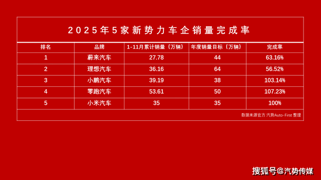 相较于传统车企,新势力品牌中零跑、小鹏和小米三家车企已提前完成既定年度销量目标,而蔚来、理想汽车销量完成率不足七成,预计达成销量目标的计划落空。