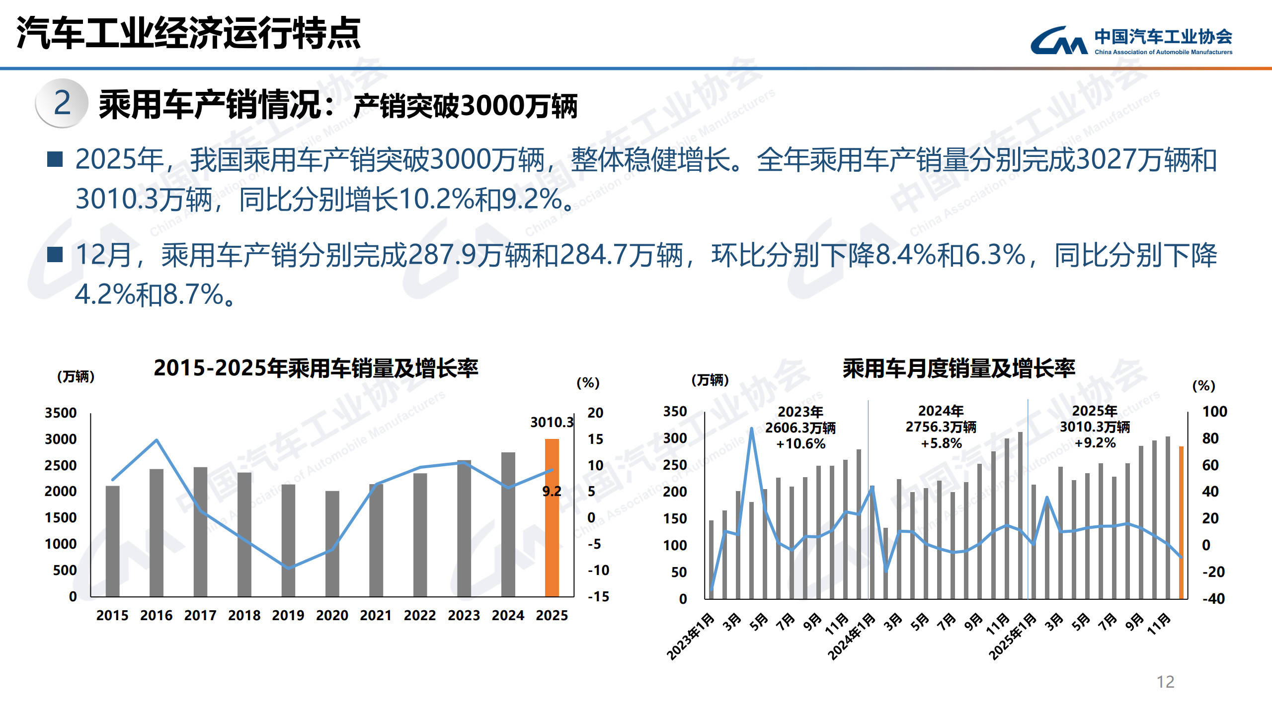 2025年,汽车产销累计完成3453.1万辆和3440万辆,同比分别增长10.4%和9.4%,产销量再创历史新高,产销规模连续3年保持在3000万辆以上。