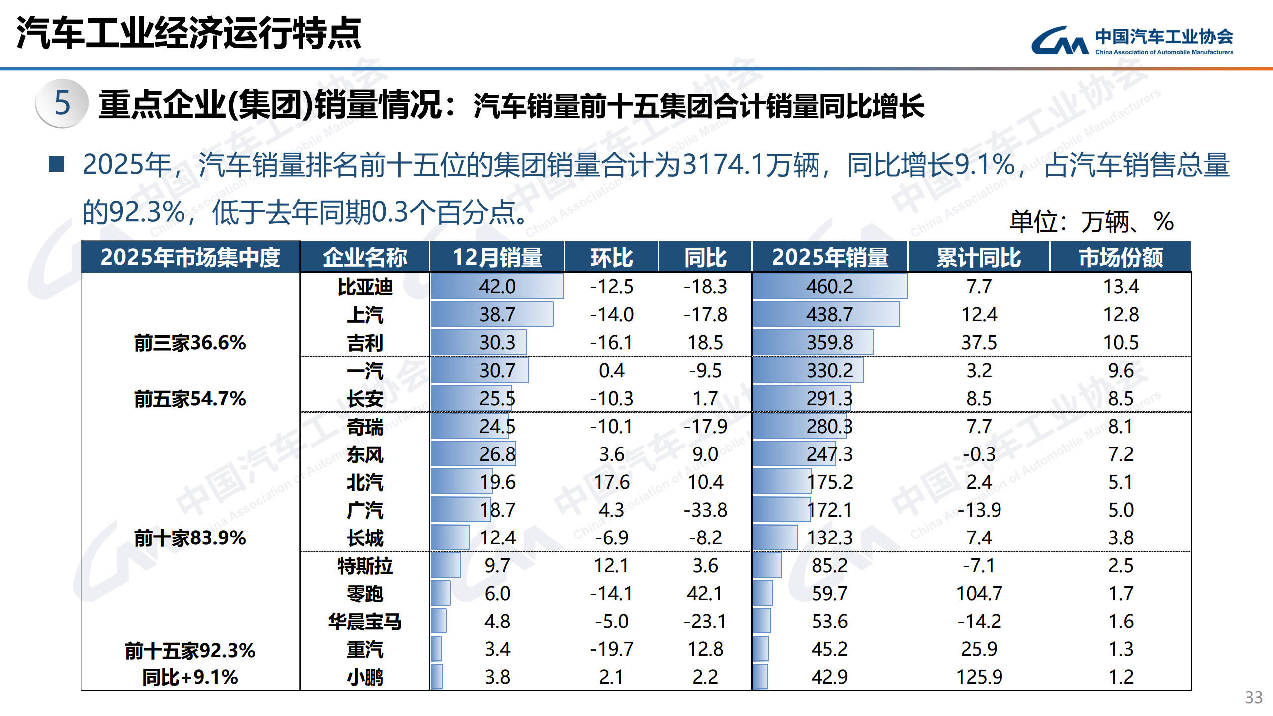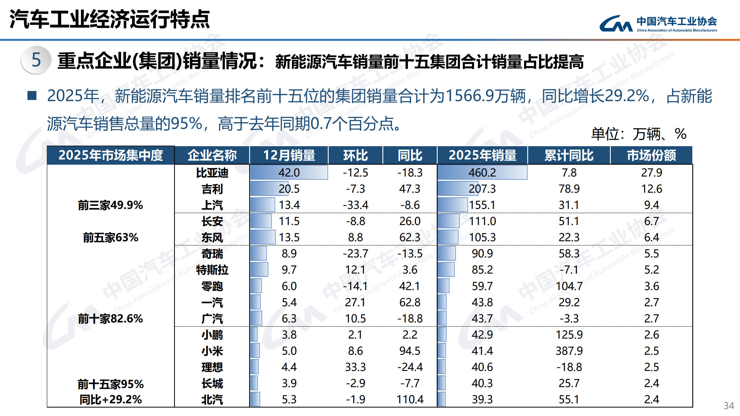 2025年,新能源汽车销量排名前十五位的集团销量合计为1566.9万辆,同比增长29.2%,占新能源汽车销售总量的95%,高于去年同期0.7个百分点。