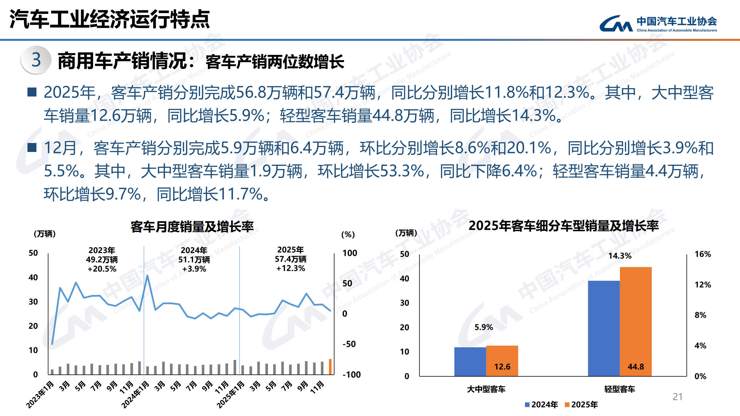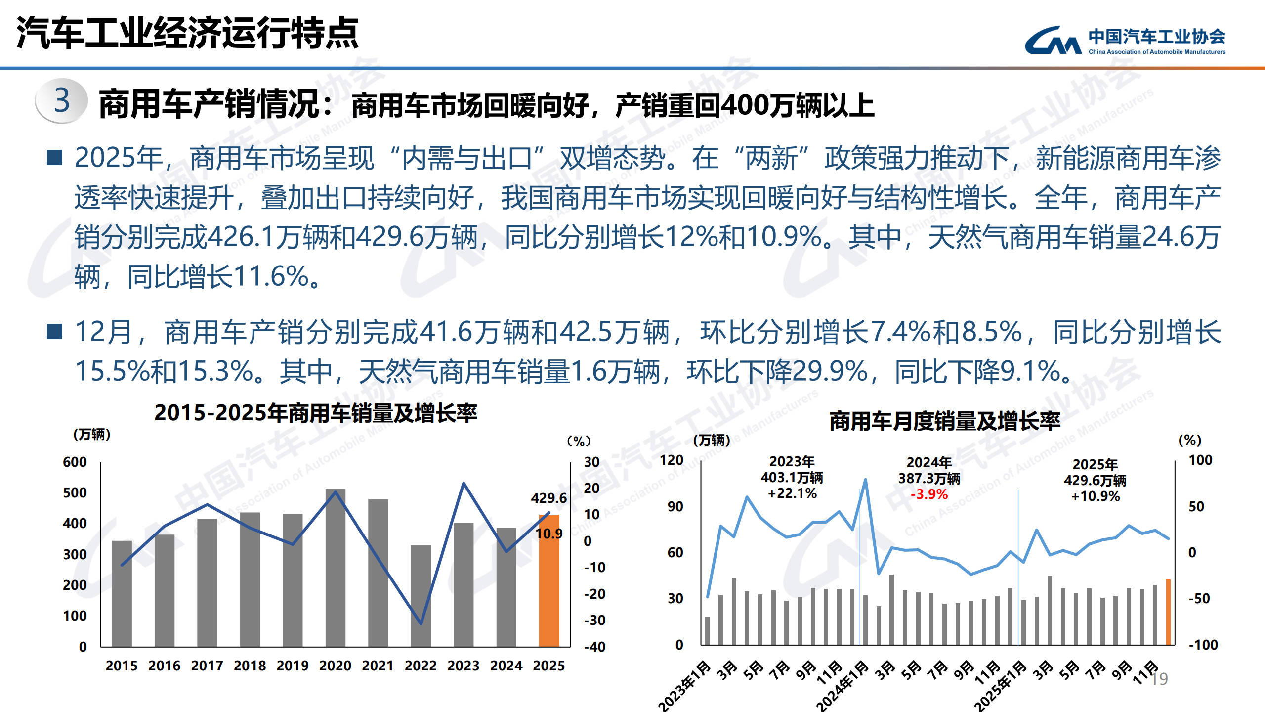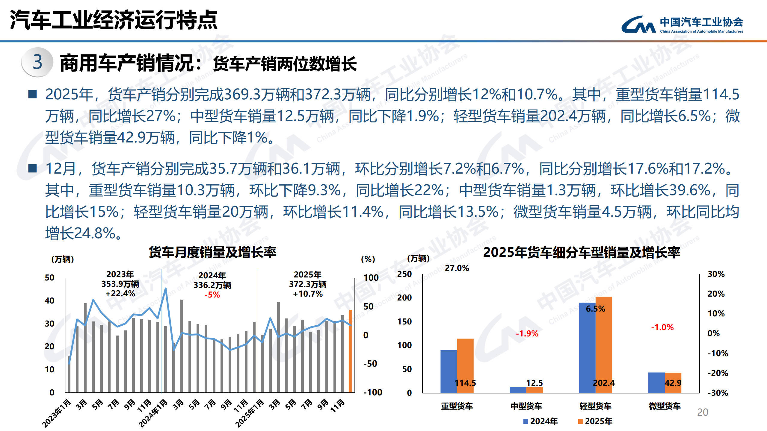 2025年,商用车产销累计完成426.1万辆和429.6万辆,同比分别增长12%和10.9%,产销回归400万辆以上。在商用车主要品种中,与2024年相比,客车和货车产销均呈实现10%以上增长。