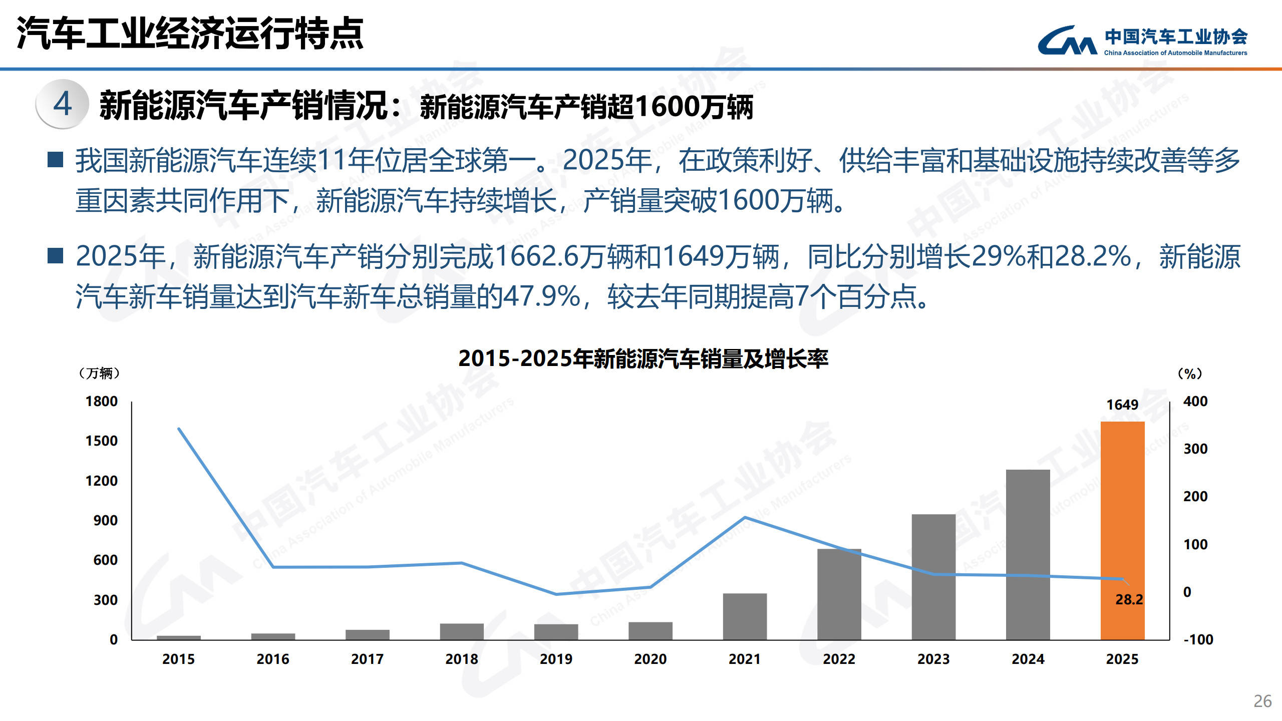 2025年,新能源汽车产销累计完成1662.6万辆和1649万辆,产销量再创历史新高,同比分别增长29%和28.2%,新能源汽车新车销量达到汽车新车总销量的47.9%。在新能源汽车主要品种中,与2024年相比,三大类新能源汽车品种产销均呈不同程度增长。