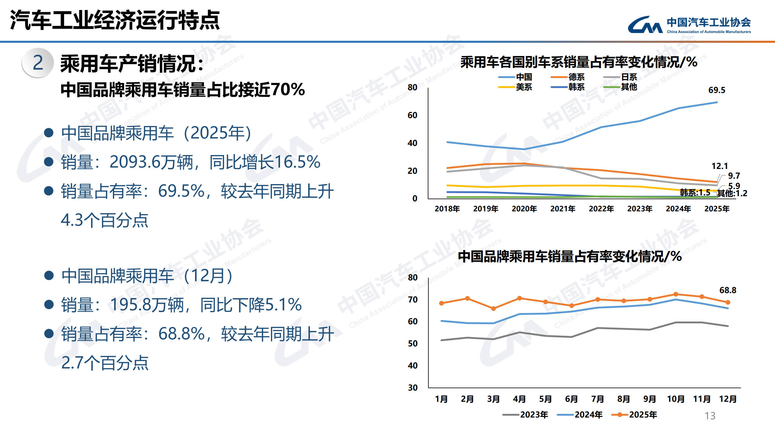2025年,中国品牌乘用车共销售2093.6万辆,同比增长16.5%,占乘用车销售总量的69.5%,销量占有率比2024年同期提升4.3个百分点。在主要外国品牌中,与2024年同期相比,美系品牌和韩系品牌销量呈不同程度增长,其他三大主要品牌销量呈不同程度下降。