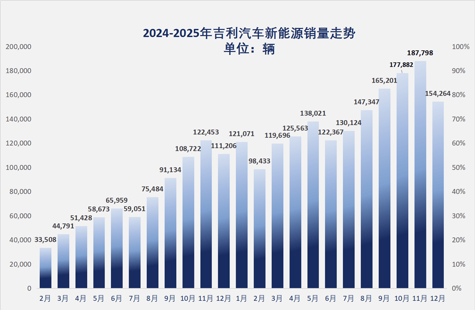 尤为亮眼的是,在比亚迪零售销量同比下滑6.3%的背景下,吉利成为头部自主车企中唯一保持高速增长的企业,两者之间的差距正在逐步缩小。特别是在新能源领域,2025年吉利实现了质的飞跃,全年新能源批发销量达168.77万辆,同比增长90%,近乎翻倍。